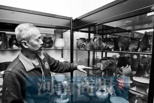 “這個是商代的鬲,這個是漢代的陶,這個是五代時期的玉枕……”河南鄭州某小區(qū),在59歲敬勤儉的家中,說起展示柜中的藏品,他一臉的寵溺?!捌林亍薄昂每吹煤堋笔撬f到這些寶貝時用得最多的話,這些都是敬勤儉在近20年里撿來的。
