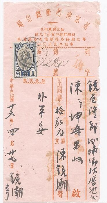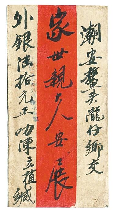 ▲紅條封,僑批封面紅白相間,正中為紅色。常見于清末、民國(guó)至新中國(guó)成立之后。