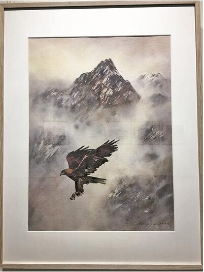 雄鷹展翅翱翔、盤旋于海灣、高山的上空,這是蔣燁教授水彩畫中的場(chǎng)景。概括凝練的風(fēng)景,氣度非凡的飛鷹,一動(dòng)一靜間把融合中國(guó)傳統(tǒng)文化的現(xiàn)代水彩語境表現(xiàn)得酣暢淋漓。開幕當(dāng)天,蔣燁將畫作《海·鷹》贈(zèng)送給了龍崗區(qū)人民政府。