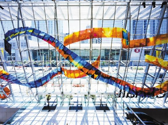 ▲盛姍姍在香港國(guó)際金融中心二期(IFC)的作品《舞動(dòng)的絲帶》。 (受訪(fǎng)者供圖)