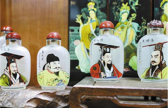 談及創(chuàng)作過程,楊藝說,鼻煙壺內(nèi)畫的制作,一般是在水晶壺或素玻璃壺內(nèi)壁,用特制的細(xì)筆,蘸取少許墨汁顏料,從小口中深入瓶中,反手作畫。創(chuàng)作內(nèi)畫,在常人看來,不可思議之處是有限的空間以及需要反手作畫,這也是每一個內(nèi)畫師面臨的主要難題所在,“創(chuàng)作內(nèi)畫時,需要在這盈寸天地間做到手指和筆桿揮灑自如,這極其考驗(yàn)一個人的耐性。一手執(zhí)壺,一手作畫,作畫時需要在壺內(nèi)反手描繪,如此,才能讓人們在外部看到正面的畫像結(jié)構(gòu)?!眱?nèi)畫的難度還在于,要長期低頭畫畫,因此還導(dǎo)致頸椎疼痛,中途為了治療疼痛休畫了好長一段時間。