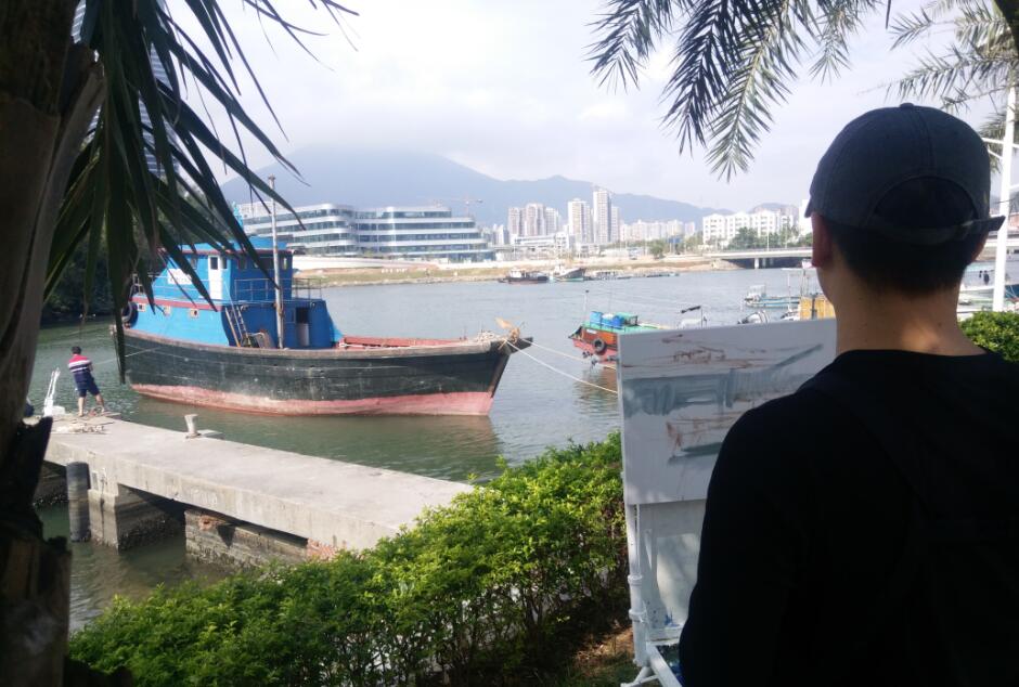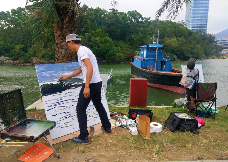 優(yōu)美的景色映入畫家們眼簾,點燃了他們的創(chuàng)作激情。來到鹽田之后,藝術(shù)家們紛紛找好寫生地點,擺好畫架,迅速進入創(chuàng)作的狀態(tài)。他們當中一部分來到了鹽田漁港,鹽田海鮮街后的小漁村避風港。蔚藍的大海、旁邊的綠樹、避風塘內(nèi)停泊的船只、白色的海鳥、釣魚的人以及遠方火熱的建設(shè)場景都呈現(xiàn)在畫家的筆端;另一部分藝術(shù)家來到了位于三洲田深圳會計進修學院的梧桐溪谷,小橋流水人家、奇石山林則一一被傾注于畫紙。