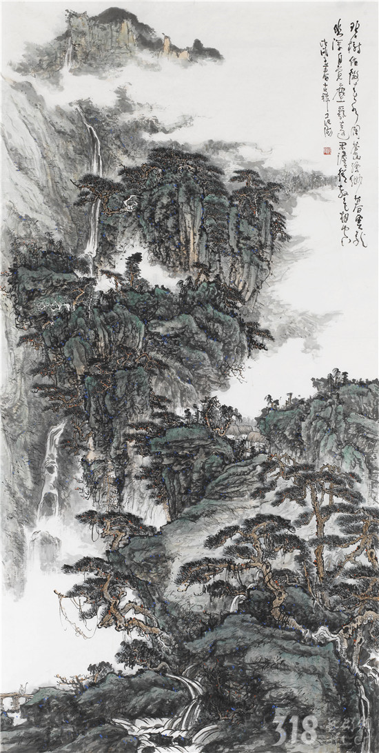 范陽先生的山水畫,筆法近取傅抱石、黃秋園,遠(yuǎn)溯“元四家”中黃公望、王蒙。筑居楊岐山下,使先生日夜親近自然山水,吐納天地,養(yǎng)浩然之氣。“外師造化,中得心源”,唐代張璪一言道破了山水畫家修養(yǎng)、悟性的不二法門。范陽先生正是以自然(造化)為營養(yǎng),入而為心靈化育,镕冶成亦古亦新,遠(yuǎn)離塵俗的獨特風(fēng)格。近作《松風(fēng)泉聲》(五屏聯(lián))氣勢磅礴,大開大合,細(xì)究又十分謹(jǐn)嚴(yán)。筆墨與丘壑融為一體,既豪放又穩(wěn)健。淺絳青綠的設(shè)色,使畫面有蔥翠欲滴之感??胺Q山水畫中的經(jīng)典。