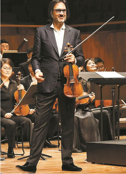 11月9日晚,萊昂尼達(dá)斯·卡瓦科斯一身閃亮深灰西服走上廣州星海音樂(lè)廳的舞臺(tái),除了飄逸的長(zhǎng)發(fā),其高大的身材和硬朗的臺(tái)風(fēng)超乎我的想象。其個(gè)頭目測(cè)至少1.8米,余隆站在指揮臺(tái)上比他也高不了多少。這使他手中的小提琴更顯得玩具般小巧玲瓏。有樂(lè)迷驚呼:這該俘獲多少小迷妹呀。