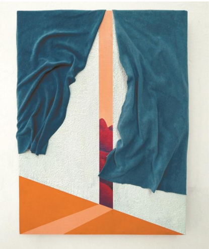 另一方面,青年藝術(shù)家們的創(chuàng)作又明顯與深圳這個急劇擴張的城市都市化景象發(fā)生了疊合。比如林海東的《紅山》,運用布面油畫與真實的絨布營造了一道門縫外的風景,暗紅的土地帶著一束光似乎就是它本身的倒影;江安使用極簡的方式,彎曲的鐵條、折疊的木板、簡單的霓虹燈便組成了他的《木門》;武學斌將無數(shù)由遠及近的立方體組成了他的《城市》,矛盾的空間、散亂的信息以及兩側(cè)高聳的堅墻述說了置身于城市之中人的壓力。