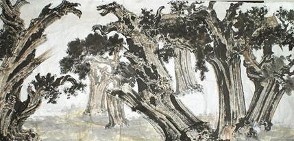 另一個他擅長的題材是古柏樹。1992年他去泰山采風途中。山上的古柏樹生機勃發(fā),堅韌不拔,給他帶來了一種震撼的力量。他當時就想將這些古柏入畫,為古柏注入精神意義。從此,在孔府、孔林、古蜀道以及陜西等地都留下他觀察古柏的足跡。有評論家認為,他的藝術作品不但在整體的構圖上自然、清新和潤朗。而且在整體的布局上,疏密相間,虛實相融,用獨有藝術感覺構建出了一個既蘊含了詩情畫意,又張揚了文化魅力和內(nèi)心情感的藝術空間。