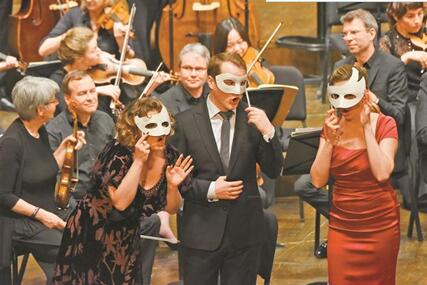 經過對歌劇《唐璜》的嚴謹考證,勒內·雅各布斯以鮮活的“古樂”形式還原了早期古典主義歌劇的音樂特質。據凱撒介紹,昨晚的演出與以往歌劇表演有很大不同。音樂會版的歌劇《唐璜》中,樂團、指揮、獨唱與合唱團都在舞臺上,演員不僅會在臺前演唱,還穿梭在樂團中,帶來生動的演出。