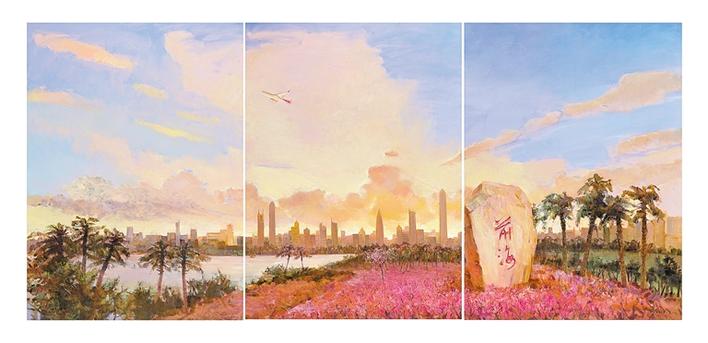 在創(chuàng)作中,文禎非用了現(xiàn)實(shí)的元素,前海標(biāo)志性石碑,棕櫚樹代表著南方特征,前海距離寶安機(jī)場(chǎng)很近,天空中的深航飛機(jī)象征著深圳開放的胸懷,遠(yuǎn)處平安大廈等標(biāo)志性現(xiàn)代化建筑一字排開,地面是深圳市花簕杜鵑……“這些都是深圳人熟悉的現(xiàn)實(shí)素材,在畫面展現(xiàn)時(shí)更多地把對(duì)深圳未來發(fā)展的憧憬和信心放入了畫面,調(diào)整了前海石碑與建筑的視覺關(guān)系,地面一片簕杜鵑是深圳創(chuàng)業(yè)初期英雄主義激情的象征,更代表著新時(shí)期深圳創(chuàng)新創(chuàng)造的活力與熱情;現(xiàn)代建筑的背景也預(yù)示著深圳40年來的成就也為前海發(fā)展提供了堅(jiān)實(shí)基礎(chǔ);早晨天空中朝霞放射狀的光芒萬丈,表達(dá)了對(duì)未來的憧憬……”文禎非滔滔不絕中透露出創(chuàng)作時(shí)的激情。