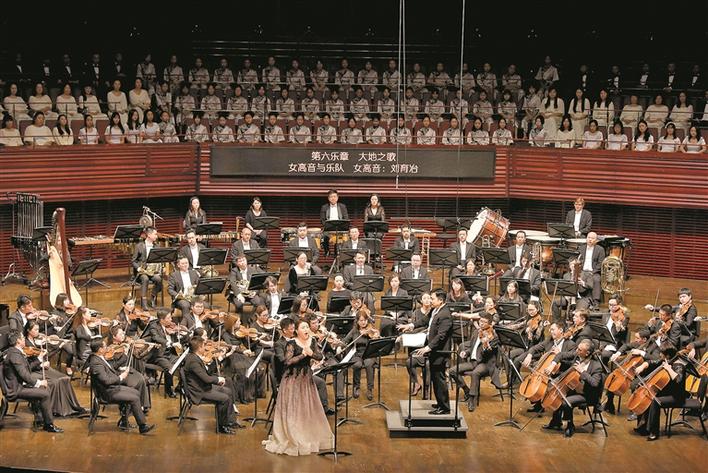 昨晚,大型交響套曲《我的祖國(guó)》奏響深圳音樂廳。圖為女高音歌唱家劉育冶傾情演繹《大地之歌》。
