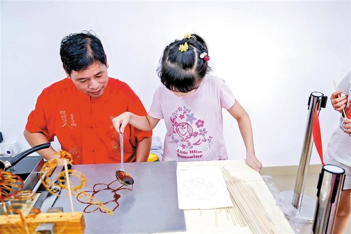 系列活動(dòng)中最受小朋友歡迎的還要屬糖畫(huà)了。糖畫(huà)是一種傳統(tǒng)民間手工藝,以糖為材料來(lái)作造型的。所用的工具僅一勺一鏟,糖料一般是紅、白糖加上少許飴糖放在爐子上用溫火熬制,熬到可以牽絲時(shí)即可用來(lái)澆鑄造型了。陪伴小朋友們的家長(zhǎng)表示,孩子親自動(dòng)手制作,既能加深對(duì)民間藝術(shù)的認(rèn)識(shí)和濃厚興趣,又能增強(qiáng)動(dòng)手能力,十分有意義。而小朋友們則認(rèn)為,不光可以學(xué),還可以吃,真好。
