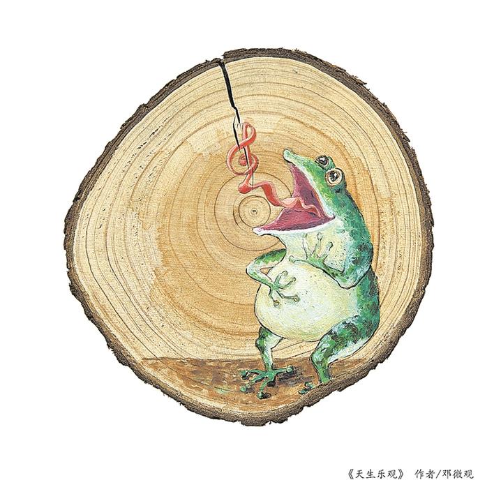 上榜漫畫家鄧微觀系深圳市寶安區(qū)打鐵文藝社社長(zhǎng),其《感物系列》以見(jiàn)物興感為主線,展開(kāi)豐富的想象力,用動(dòng)物擬人的方式幽默詼諧地抒發(fā)人生感悟,讓人會(huì)心一笑之余引起共鳴,令觀眾感嘆藝術(shù)家的漫無(wú)邊際的“腦洞”。對(duì)于作品首次入選國(guó)內(nèi)美術(shù)界規(guī)格最高的國(guó)展,鄧微觀很興奮:“這是對(duì)我這個(gè)系列作品的高度肯定?!薄陡形锵盗小废盗凶髌吩从谒e逛發(fā)呆時(shí)的想象碎片,將這個(gè)碎片貫穿就成了這個(gè)系列作品。鄧微觀在茶余飯后經(jīng)常到鐵崗的西鄉(xiāng)河邊散步,河中不時(shí)傳來(lái)低頻厚實(shí)的“男低音”引起他的注意,此起彼伏,聽(tīng)來(lái)如交響曲一般通達(dá)舒暢。他循聲尋覓,原來(lái)是蛤蟆的聲音,只見(jiàn)這些“音樂(lè)家”在下水道洞口,在草叢中,河道縫中快樂(lè)地歡唱……這些天生的樂(lè)觀者給鄧微觀帶來(lái)美妙的心情,所以創(chuàng)作了這幅《天生樂(lè)觀》。再如《三餐之余》,有時(shí)飯后經(jīng)常會(huì)在茶幾前發(fā)發(fā)呆,思考人生不應(yīng)該只是面包和蘋果,還應(yīng)有點(diǎn)別的……