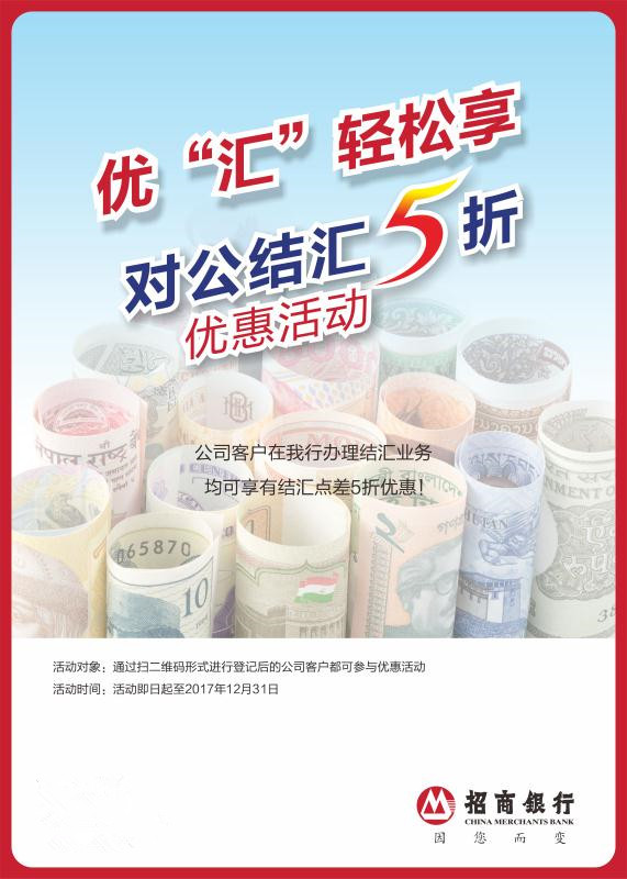 近日,記者從招行深圳分行了解到,自2017年8月1日至2017年年底,招商銀行深圳分行特別推出結(jié)匯尊享優(yōu)惠活動(dòng)?;顒?dòng)期間,凡公司客戶,可在招商銀行深圳分行轄內(nèi)(含珠海分行及惠州分行)任一網(wǎng)點(diǎn)通過掃描指定二維碼進(jìn)行登記,登記后辦理結(jié)匯業(yè)務(wù)即可享受結(jié)匯點(diǎn)差五折優(yōu)惠。(張怡)