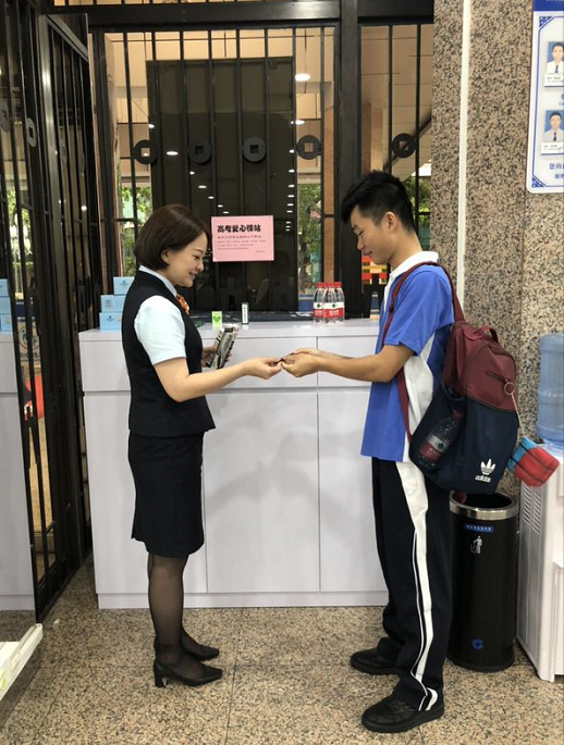 中午時(shí)分,一位紅嶺中學(xué)的考生在銀行大堂經(jīng)理的熱情招呼下免費(fèi)領(lǐng)取了文具盒礦泉水。通過(guò)聊天,這位考生表示今天上午考得很好,對(duì)建行的助力高考愛(ài)心驛站服務(wù)表示感謝。(通訊員 梁莉)