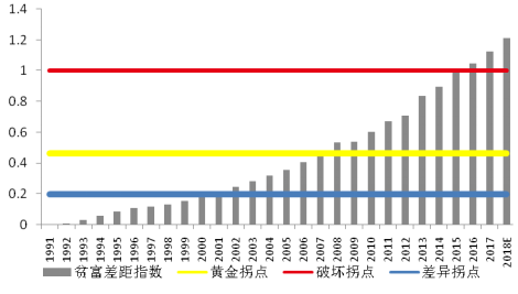 研究發(fā)現(xiàn),貧富差距指數(shù)與經(jīng)濟(jì)發(fā)展存在這三個(gè)拐點(diǎn):差異拐點(diǎn)(0.2)、黃金拐點(diǎn)(0.463)及破壞拐點(diǎn)(1)。當(dāng)貧富差距指數(shù)在0.2以下的低值區(qū)時(shí),絕對(duì)平均造成動(dòng)力不足。當(dāng)貧富差距指數(shù)高于0.2時(shí),差異的動(dòng)力效應(yīng)開(kāi)始顯現(xiàn),貧富差距指數(shù)與GDP增長(zhǎng)率存在顯著的倒U型的非線性關(guān)系。而且拐點(diǎn)在貧富差距指數(shù)等于0.463左右,對(duì)應(yīng)的時(shí)間為2006-2007年之間,貧富差距在這個(gè)水平左右對(duì)經(jīng)濟(jì)增長(zhǎng)的動(dòng)力效應(yīng)最高。當(dāng)貧富差距指數(shù)低于1時(shí),貧富差距處于合理狀態(tài),合理的貧富差距提高了居民的工作動(dòng)能,有利于促進(jìn)經(jīng)濟(jì)增長(zhǎng),但超過(guò)臨界值1,隨著貧富差距進(jìn)一步提高,貧窮人口會(huì)有日益強(qiáng)烈的被剝削感,在一定程度上抑制了經(jīng)濟(jì)總量的提升。據(jù)此,近年來(lái)我國(guó)貧富差距的演變過(guò)程可以分為四大階段,分別是“財(cái)富絕對(duì)平均階段”(1991-2001年)、“差異帶來(lái)動(dòng)力,逐步接近黃金拐點(diǎn)階段”(2001-2007年)、“貧富差異擴(kuò)大階段”(2007-2015年)及“貧富分化相對(duì)嚴(yán)重階段”(2015年至今)。經(jīng)研究團(tuán)隊(duì)測(cè)算,2018年貧富差距指數(shù)預(yù)計(jì)已超過(guò)破壞拐點(diǎn)。