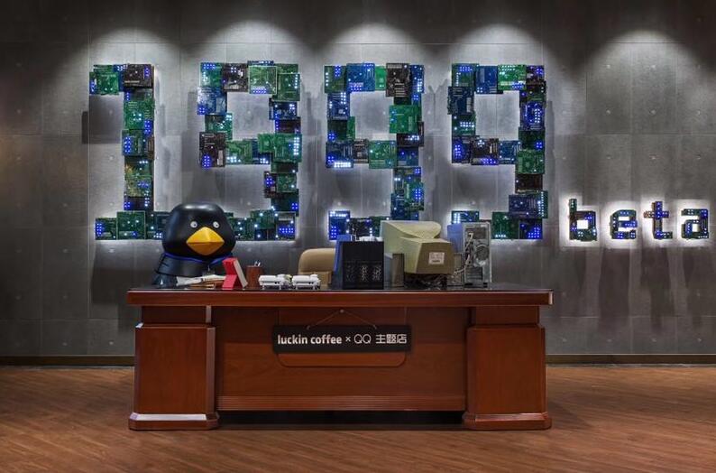 瑞幸咖啡騰訊QQ主題店距離騰訊全球總部所在地濱海大廈不到兩公里??Х鹊瓿錆M互聯(lián)網(wǎng)懷舊特色,擺放著騰訊20年前創(chuàng)業(yè)伊始的第一張辦公桌復(fù)刻版,懷舊打卡的立柱上裝飾有充滿時(shí)代特色的QQ聊天對(duì)話框,在這里還可以聽到復(fù)古的QQ提示音。1999年,QQ beta版(測(cè)試版)上線,歷經(jīng)多次迭代目前月活用戶達(dá)8億,成為全球最大的通訊社交平臺(tái)之一。