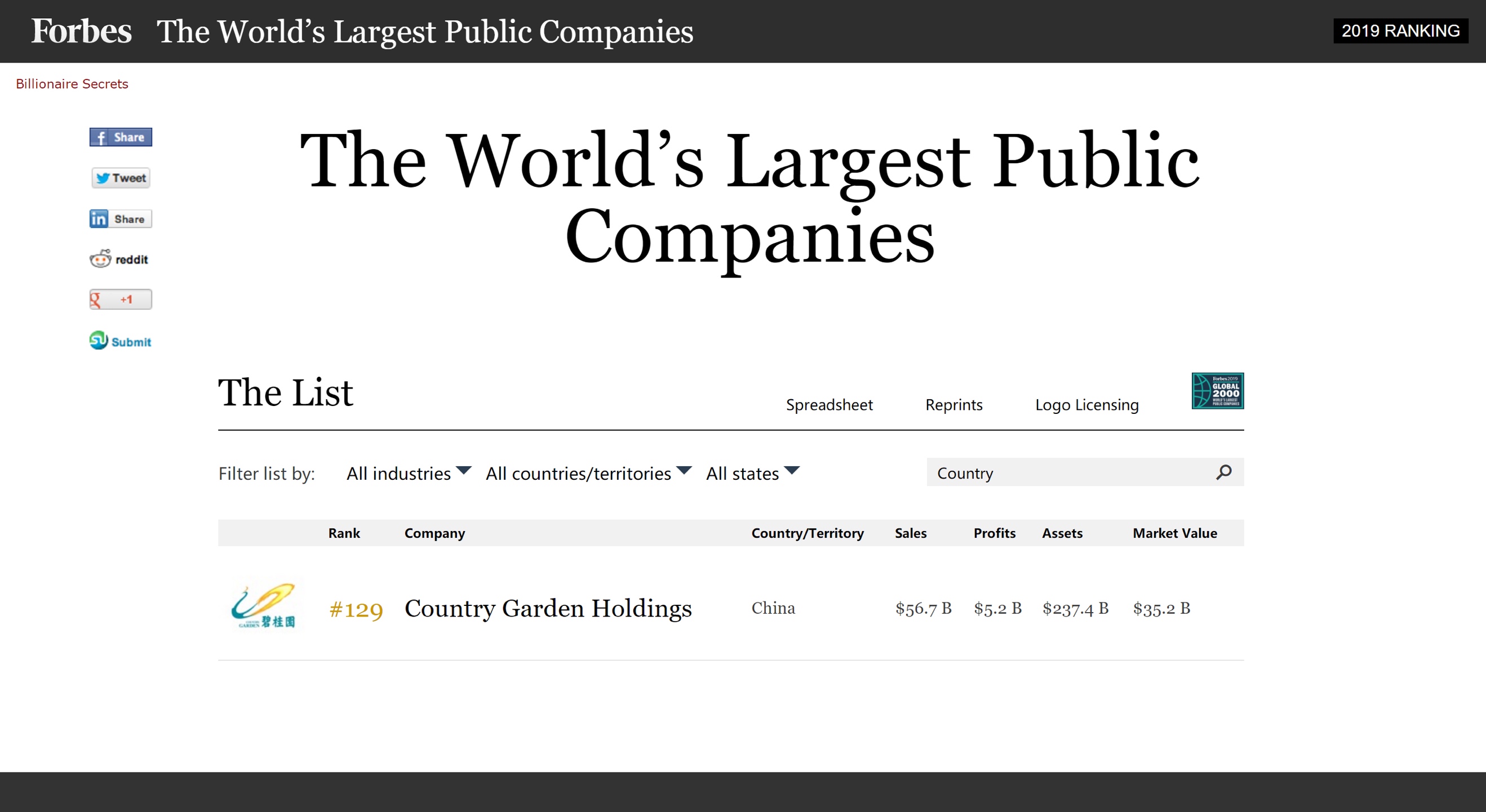 5月16日晚,權(quán)威商業(yè)雜志 《福布斯》發(fā)布了2019年全球上市公司2000強(qiáng)榜單。其中,中國龍頭房企碧桂園(02007.HK)已連續(xù)10年上榜,且排名逐年上升,最新排名升至第129位。