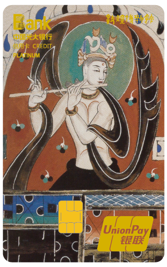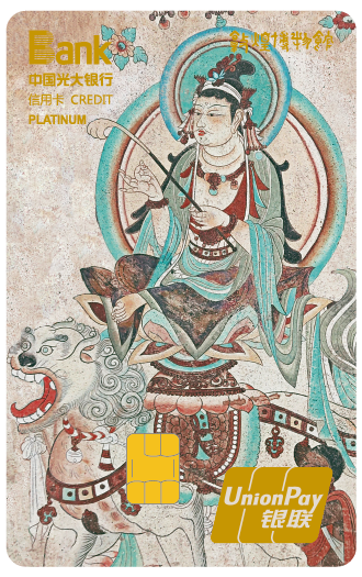 光大敦煌聯(lián)名信用卡卡面設計取材于敦煌壁畫,有敦煌大智文殊白金卡、敦煌天宮伎樂白金卡以及敦煌五百強盜成佛菁英白金卡三種信用卡。光大敦煌聯(lián)名信用卡的卡面設計靈感均來源于敦煌壁畫,大智文殊白金卡畫面為文殊菩薩結跏坐于青面獅虬首仙獅背上。文殊菩薩是專司智德、辯才第一的大菩薩,尊號“大智文殊”。天宮伎樂白金卡主體畫面為伎樂天,取材于莫高窟288窟,營造了佛陀講經(jīng)說法時佛國世界歡樂祥和的氛圍。五百強盜成佛菁英白金卡卡面設計取自“五百強盜成佛”的壁畫故事,佛用神通使被剜去雙眼的強盜重見光明,并對他們進行點化,五百強盜潛心苦修終成五百羅漢。光大敦煌聯(lián)名信用卡的卡面設計將傳統(tǒng)文化融入現(xiàn)代金融產(chǎn)品,極具敦煌文化的風格。