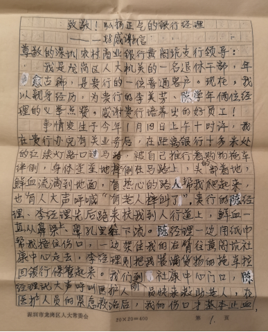 “事發(fā)第二天,該行行長(zhǎng)又派陳學(xué)年、李美芳兩位員工到我家探望、慰問,讓我全家非常感動(dòng)。”1月29日下午,傷口剛剛拆線的老人就帶著手寫的感謝信來到深圳農(nóng)商行黃閣坑支行,向幫助過他的兩位熱心人表達(dá)感謝之情。感謝信整整三頁(yè)紙,字跡工整,老人家的誠(chéng)摯感謝之意躍然紙上。
