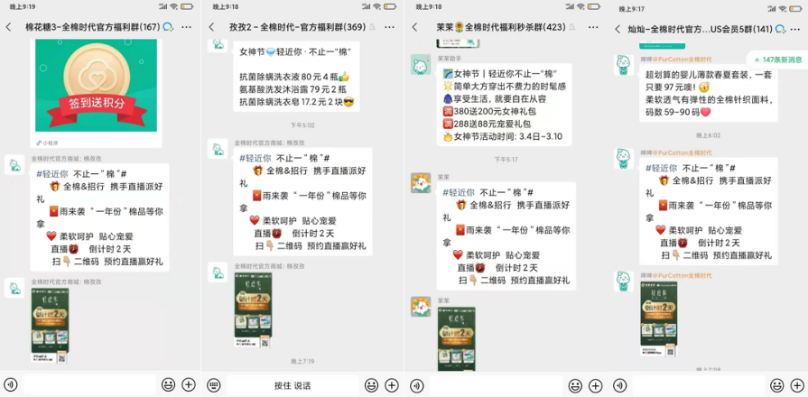 為了提升活動效果以及節(jié)日噱頭,招行深圳分行積極向商戶爭取了全棉時代的直播禮品,直播當(dāng)天全棉時代為招行用戶提供價值50萬的禮品,同時在宣傳端,為了打造活動熱點,全棉時代在超過500個社群內(nèi)進行活動推送,招行端也積極爭取總行資源,在App、微信視頻號及朋友圈進行宣傳。