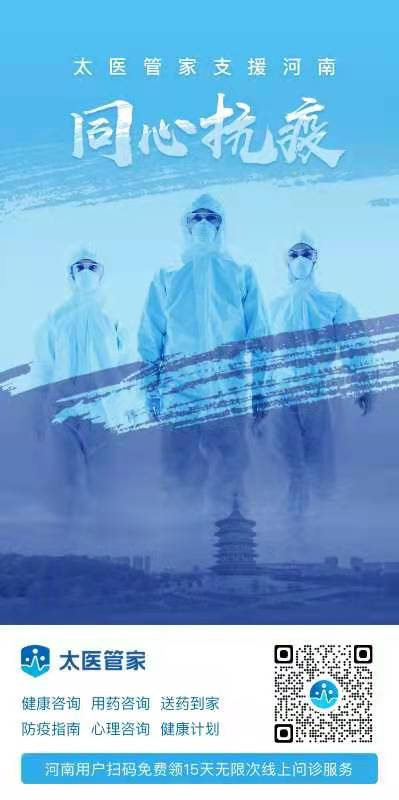 近日,河南地區(qū)出現(xiàn)多起疫情病例,為支援抗疫工作,幫助當?shù)鼐用褡龊媒】倒芾恚鰪娍挂咝判?,太?;ヂ?lián)網(wǎng)醫(yī)院——太醫(yī)管家繼向西安市民開放免費線上問診通道后,再次定向河南地區(qū)居民推出在線問診服務(wù)。