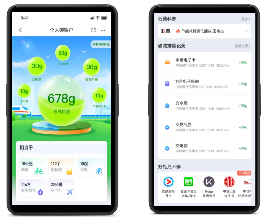 中信銀行積極發(fā)揮集團協(xié)同優(yōu)勢,持續(xù)推動綠色金融產(chǎn)品創(chuàng)新。其中,“中信碳賬戶”是中信銀行積極響應政府號召,圍繞城市的碳普惠機制建設,首個由國內(nèi)銀行主導推出的個人碳賬戶,通過發(fā)揮金融科技優(yōu)勢,以科學計量方法累計個人碳減排量,讓用戶的綠色低碳行為可計量、可追溯,推動綠色低碳廣泛融入民眾生活,讓綠色成為經(jīng)濟發(fā)展、社會生活的“主色調(diào)”。