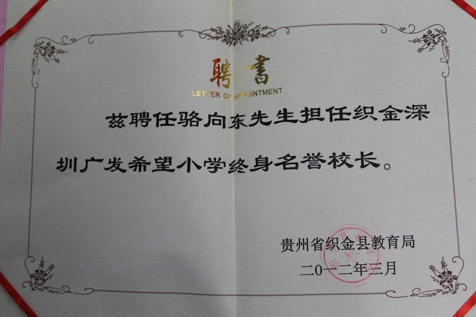 2013年,在駱向東的退休儀式上,織金縣教育局將一張希望小學(xué)終身名譽(yù)校長(zhǎng)的聘書,鄭重交到了他的手上?!拔液軜s幸能代表廣發(fā)銀行深圳分行黨委去推動(dòng)這件事,但公益事業(yè)任重道遠(yuǎn),我相信愛心基因會(huì)在廣發(fā)一直傳承下去。”事實(shí)也正如駱向東所言,從1998年籌建希望小學(xué)至今,一代代廣發(fā)人身體力行,讓愛心助學(xué)一棒接力一棒。
