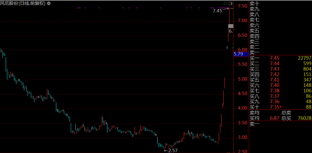 風(fēng)范股份自去年12月26日以來已連續(xù)獲得10個(gè)漲停,股價(jià)一路飆升至7.45元,成為A股新妖王。