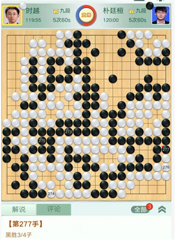 第二臺主將,由深圳隊(duì)時越九段執(zhí)白對陣成都隊(duì)韓國世界冠軍樸廷桓九段。開局下方雙方各有小失誤,局面均勢。之后左上黑棋行棋過分,白棋領(lǐng)先。白棋在黑右上角破空形成打劫,黑棋連走兩手分開右邊白棋進(jìn)行攻擊。白棋治孤中錯失簡明獲勝的下法,但是活出后依然稍好。緊接著白棋沒有選擇最大的官子,被黑棋走到后黑棋領(lǐng)先。之后黑棋官子收束滴水不漏,以最小差距3/4獲勝。時越執(zhí)白3/4子負(fù)樸廷桓。