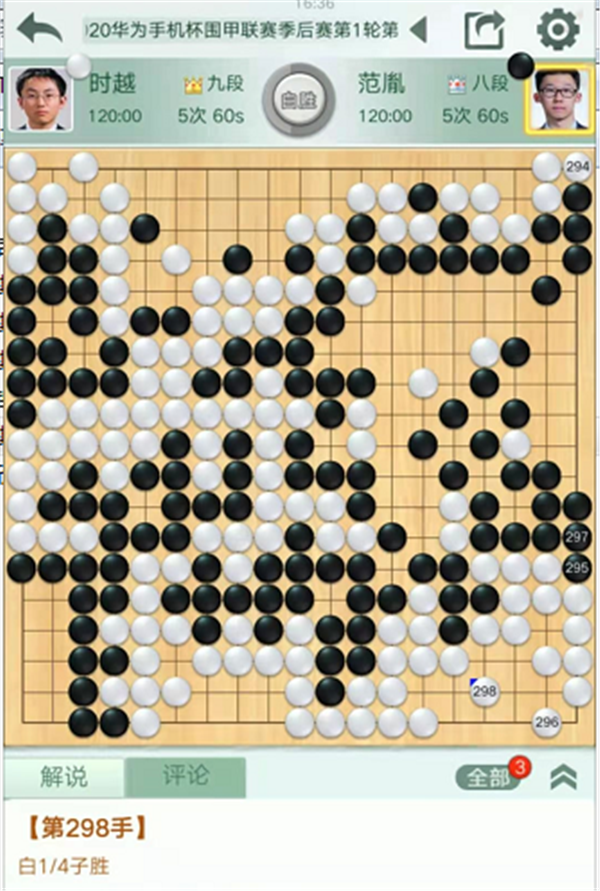 慢棋臺第四臺由深圳隊的時越九段執(zhí)白對陣民生隊的范胤八段。中盤右邊白棋進(jìn)入黑空形成打劫,劫活后局面領(lǐng)先。中央黑棋進(jìn)攻白棋時候失誤,白棋優(yōu)勢擴(kuò)大。之后黑棋左邊行棋時候,白棋一直沒有脫先搶占右邊大棋,而是在左邊連續(xù)失誤并且落了后手。被黑走到右邊后黑棋大幅領(lǐng)先。之后右下角形成復(fù)雜的打劫,黑棋可以選擇走成三劫循環(huán)和棋后加賽,但是黑棋判斷即便放棄和棋也是局面有利。實(shí)戰(zhàn)白棋一直不補(bǔ)搶收官子,最終判斷獲勝時候?qū)⑷傺h(huán)變化解消,白棋1/4子獲勝。時越1/4子勝范胤。