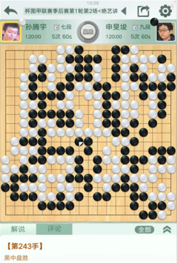 慢棋第三臺由深圳隊的外援申旻埈九段執(zhí)黑對陣民生隊的孫騰宇七段。中盤白棋上方和中央聯(lián)系失誤,黑棋領(lǐng)先。黑棋對中央白棋大龍和左下白棋大龍展開纏繞攻擊,最后穩(wěn)健的讓白棋做活進(jìn)入官子。最終黑棋以3/4子的最小差距獲勝,申旻埈3/4子勝孫騰宇。