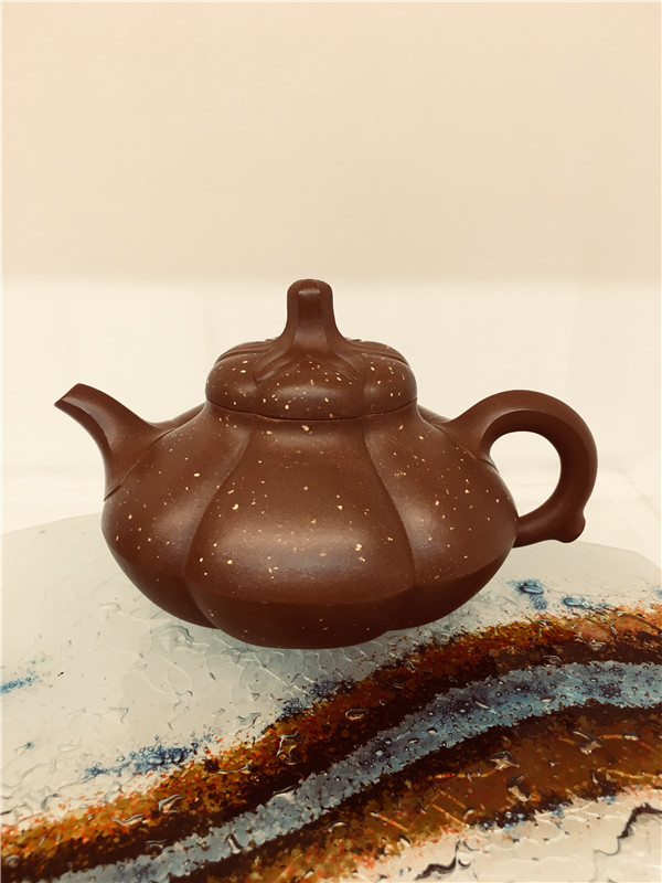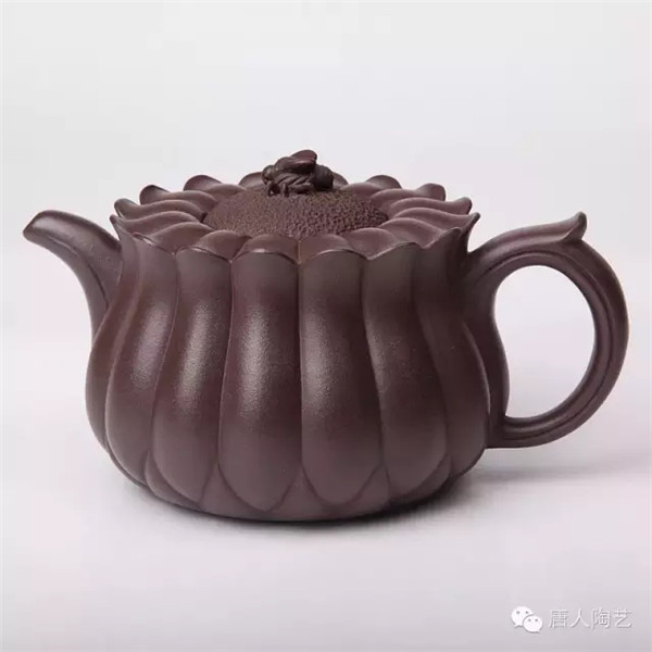 第一件,《蜂菊壺》取材于大自然蜜蜂采蜜之情形,立意新穎。壺身等分成十六瓣,俯視如盛開(kāi)的菊花,蓋為花蕊,壺鈕設(shè)計(jì)成正在花蕊上采蜜的蜜蜂。顯得靜中有動(dòng),生機(jī)盎然,側(cè)視該壺,筋囊飽滿凝重,通體線條流暢,大氣中不乏精巧。菊花與蜜蜂肖形逼真,洋溢著大自然的和諧情趣。據(jù)說(shuō),唐朝霞老師為制作此壺,多次徘徊在桃花林里、菊花叢中,觀察蜜蜂的神態(tài),巧妙地讓蜜蜂造型躍然“蜂菊壺”壺鈕上,靜中寓動(dòng),令人叫絕。