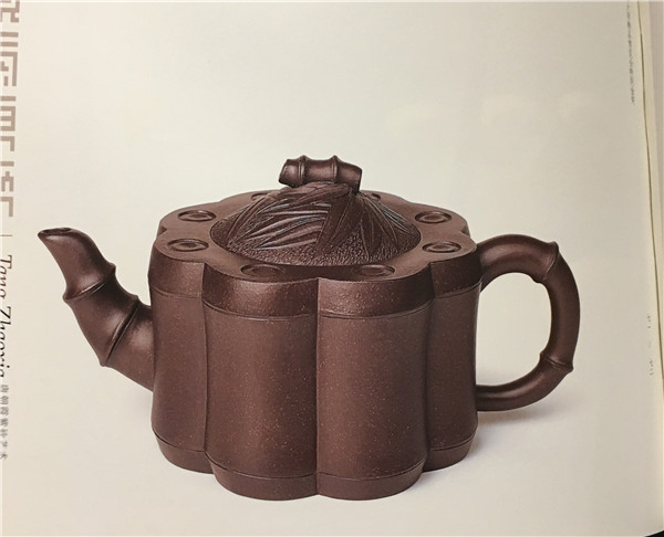 第六件,《亮節(jié)壺》以竹為主題,壺身由八節(jié)竹子圍起,竹節(jié)形的壺鈕、壺把、壺嘴相互呼應(yīng),壺蓋飾有竹牙竹葉,營(yíng)造了秀美典雅,清朗高潔的風(fēng)骨與氣質(zhì)。