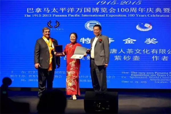 2015年底,巴拿馬太平洋萬(wàn)國(guó)博覽會(huì)在美國(guó)拉斯維加斯舉行,唐朝霞選送參展的“蜂菊壺”榮獲特別金獎(jiǎng),她也因此成為新中國(guó)成立以來(lái)唯一獲此國(guó)際大獎(jiǎng)的女性紫砂藝術(shù)家。