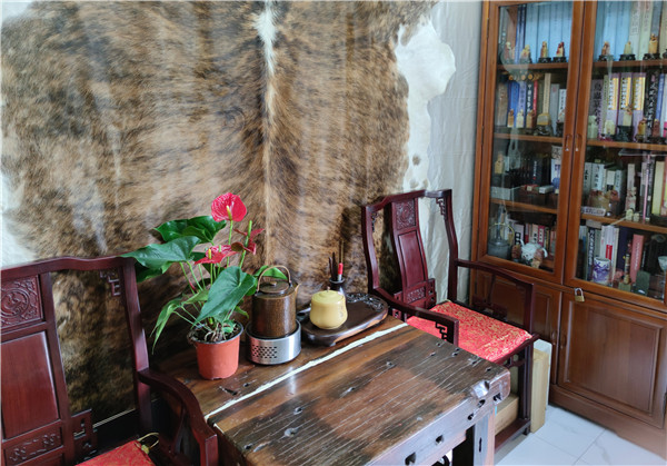 俗話說得好:見識一個素養(yǎng),看看他的書房就知道了!那么,寧起興老師的書房是什么樣的呢?第一印象:簡潔、古樸、有趣味。一眼掃去,臨窗一張紅木桌,兩個裝得滿滿的老書柜,兩張烏黑發(fā)亮的南官帽椅,中間配有一張老舊的喝茶的原木桌,正上方的墻面掛著一整張大大的南美阿根廷牛皮。墻上橫掃,掛有“室靜書馨”的書法作品,一張古琴,一把薩克斯,幾份有關(guān)他篆刻宣傳的剪報,還有星星點(diǎn)點(diǎn)的各類鈴鐺。細(xì)看呢:書柜里的篆刻工具書,有大部頭的字典、印譜和系列叢書,也有與篆刻相關(guān)的文化類書籍,大多插滿了顏色各異的標(biāo)簽,可見寧老師讀書的細(xì)致與用心。紅木大桌上有一對大音箱,是原裝進(jìn)口的德國貨;桌子旁,有一正方形的小桌特別顯眼,寧老師帶著些許自豪的神態(tài)介紹說,鉗臺是德國進(jìn)口的,鋸子也是原裝進(jìn)口的,那個刻銅印的印盤是定制的。還有,他所用的刻刀頂端印有l(wèi)ogo,是小篆“寧”字與工字的合寫,該刀鋼材鈷含量為17%,也是定制的。正所謂“工欲善其事,必先利其器”,寧老師深以為然。是以,他在工具上追求“高精尖”甚至不惜工本。