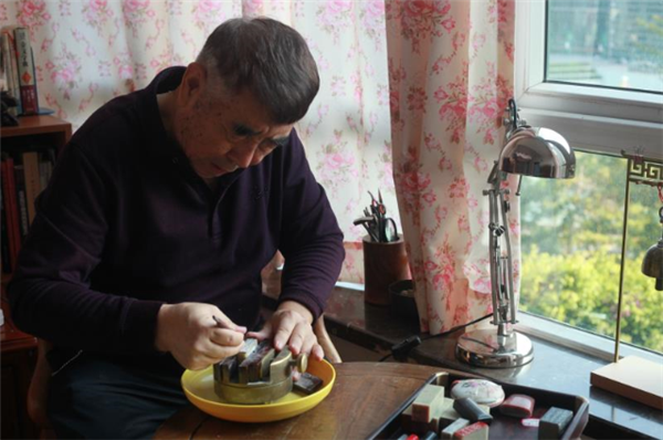 最后,請寧老師對治印的后學(xué)說幾句,他說“什么時候都不晚,只要肯開始,找到好的老師,持之以恒,便有機(jī)會成功”,自己的經(jīng)歷就是一個證明吧。也是,當(dāng)下中國逐漸進(jìn)入“老齡化社會”,許多老人退休之后“無所事事”,等退體金、等“臨門一腳”成為常態(tài)。而寧起興憑著一份興趣,六十歲而后拓出一片天地,堪為榜樣!令人欣喜是,他的行為對子孫也是一種言傳身教,小外孫女2歲時在街上看到篆字招牌,馬上就說這是姥爺?shù)淖?。平日,她還學(xué)著姥爺讀書刻章的模樣,做手工、畫畫,常有創(chuàng)意。看到這一幕,作為古稀老人,寧起興感到非常欣慰。他說,自己做到了“老有所為”,還產(chǎn)生了教化子孫的效果,開心是自然的。他希望更多的人喜歡中國篆刻藝術(shù),希望更多的退休老人們生活充實(shí)、老有所為!