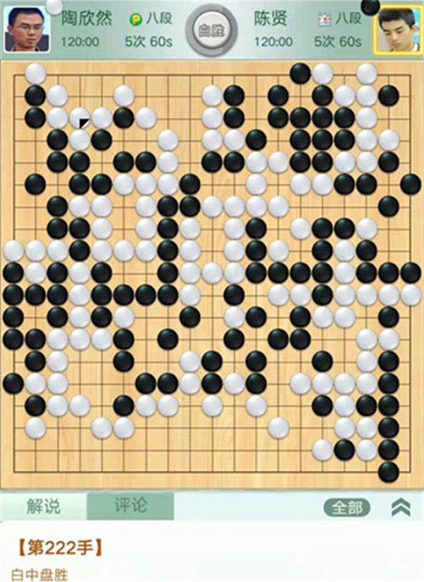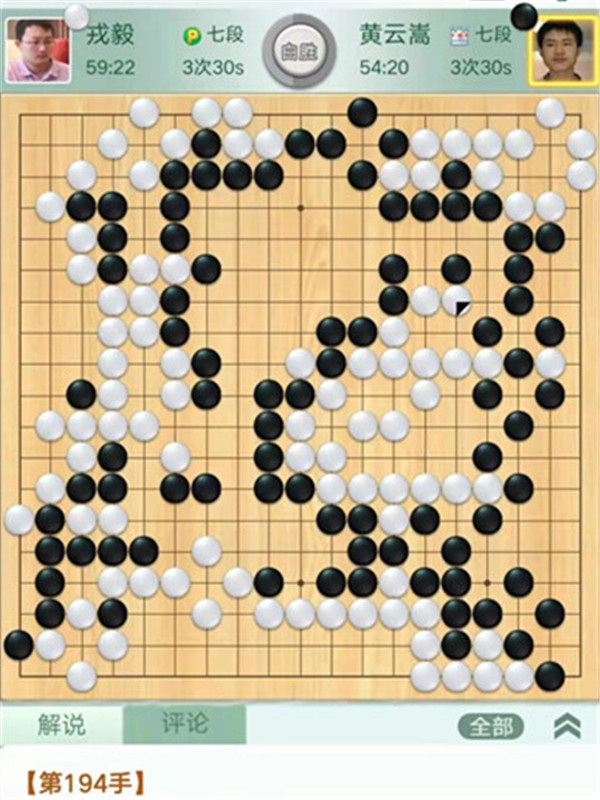 今日比賽中,申旻俊主將執(zhí)黑對陣新二冠羋昱廷,開局左上角申旻俊配合小米使出羋氏飛刀,結(jié)果是飛刀不成功黑棋局面領(lǐng)先。中盤黑棋攻擊中央白棋時(shí),白棋脫先搶占實(shí)地。被黑手起刀落斬殺大龍,局終??炱迮_,去年屢立戰(zhàn)功的戎毅七段執(zhí)白對陣黃云嵩七段,行棋穩(wěn)健,占居三個(gè)角之后,又在中間活出一大塊,行棋至194手勝。三臺陶欣然八段對陣陳賢八段,行棋222手白中盤勝。四臺時(shí)越九段對趙晨宇一戰(zhàn),行至284手,以四分之三子微弱優(yōu)勢取勝。