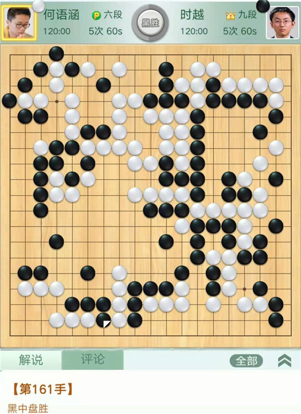 緊接著,一臺(tái)時(shí)越九段執(zhí)黑對何語涵六段干凈利落,時(shí)越在對局中充分發(fā)揮自身勢大力沉的棋風(fēng),以凌厲的屠龍刀法絕殺一條大龍,痛快淋漓地結(jié)束了戰(zhàn)斗。關(guān)鍵節(jié)點(diǎn)在中盤,黑棋對右邊白子簡單吃住尾巴則優(yōu)勢,實(shí)戰(zhàn)黑棋追求整體殺白,白棋應(yīng)對失誤大龍憤死,行棋161手。