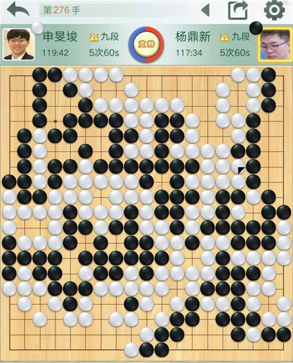 二臺(tái)主將申旻俊執(zhí)白對陣楊鼎新。右邊戰(zhàn)斗黑棋有所失誤,白棋局面大好。后來黑棋頑強(qiáng)追趕,最終還是白棋以最小優(yōu)勢1/4子獲勝。