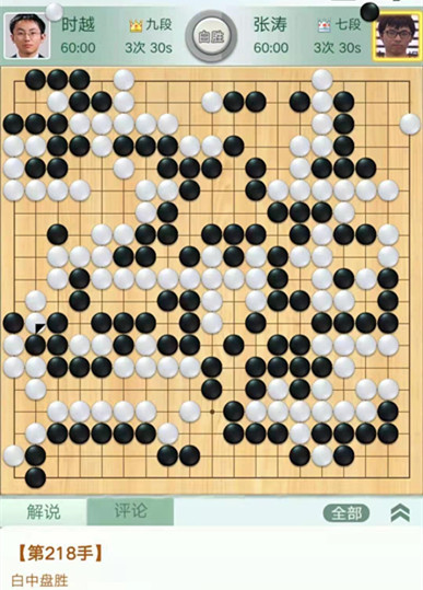 時(shí)越快棋執(zhí)白對陣張濤。右邊作戰(zhàn)時(shí)候,黑棋沒有選擇造劫劫爭而是退讓,被白將右邊幾子吃掉后又吃掉右上黑棋,黑棋局面落后。之后黑棋右下又死活看錯(cuò)被白先手活出,導(dǎo)致雪上加霜,實(shí)際上棋局已經(jīng)結(jié)束。