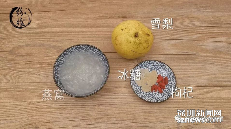 泡發(fā)好的燕窩一份、雪梨一個、冰糖和枸杞若干。
