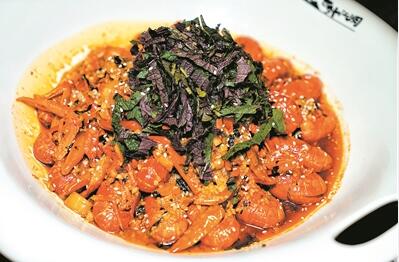 廚師用了特別從湖南長沙選來的紫蘇,在碗底鋪上一層,再將炒制過的小龍蝦放上,最后于蝦面上多撒一層紫蘇,吃時拌起,紫蘇的香氣充分融入蝦身,風味獨特。