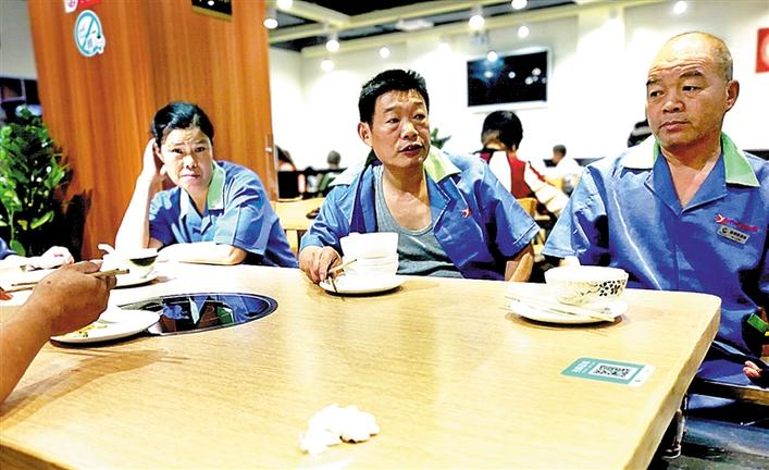 在店里吃飯的人群里,有一張臺(tái)全是清一色的藍(lán)色工作服,特別顯眼?!拔覀兠刻於紩?huì)來(lái)這里吃早餐,差不多有一年時(shí)間了,這里的老板太好了,希望他能一直開下去?!边@幾個(gè)大叔、大嬸是周邊物業(yè)的清潔工人,他們每天早上5點(diǎn)鐘就上崗工作,忙完就到了6-7點(diǎn),又餓又累,有一碗熱騰騰的早餐是一件非常幸福的事,而這種開心快樂(lè)的事情在這里發(fā)生了。吳姓清潔工說(shuō),這里的老板和員工很好,大家來(lái)這里吃粥,沒(méi)有感到半點(diǎn)不自在,就像在自己家一樣。