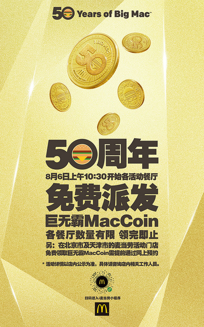為了與中國消費者一起歡慶巨無霸50周年,中國內(nèi)地指定麥當(dāng)勞餐廳將于2018年8月6日當(dāng)日免費送出超過100萬枚MacCoin。早上10:30開始,顧客前往餐廳為巨無霸唱出生日歌[ 北京市和天津市的顧客需2018年8月4日上午9:00起在“i麥當(dāng)勞”微信小程序提前預(yù)約,方可于8月6日10:30起在指定麥當(dāng)勞餐廳領(lǐng)取。],即可獲得MacCoin一枚,圖案隨機,送完即止。北京市和天津市的顧客需2018年8月4日上午9:00起在“i麥當(dāng)勞”微信小程序提前預(yù)約,方可于8月6日10:30起在指定麥當(dāng)勞餐廳領(lǐng)取。顧客可以分享與收藏,也可以在2018年12月31日前憑MacCoin在中國內(nèi)地、美國、荷蘭、新西蘭、巴西等全球超過50個國家和地區(qū)參與活動的麥當(dāng)勞餐廳,免費兌換巨無霸一個。