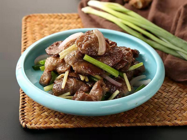 精選新鮮大黃牛的牛展肉,切薄片與生姜、香蔥、洋蔥一同快速爆炒,牛肉入口嫩滑,姜汁濃郁,帶有特別的蔥姜焦香,令人回味。