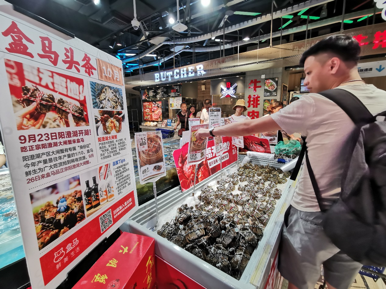 其中爆款非大閘蟹莫屬。民間有個(gè)講究:“九雌十雄”,農(nóng)歷九月吃母的大閘蟹,農(nóng)歷十月吃公的,因?yàn)槟菚r(shí)候大閘蟹的蟹黃和蟹膏是最好的。黃金周期間,盒馬深圳大閘蟹銷量與9月相比增長(zhǎng)六倍。其中最受歡迎的是2兩重的母蟹,盒馬皇庭廣場(chǎng)店假期里試過(guò)一天賣出近兩千只大閘蟹。