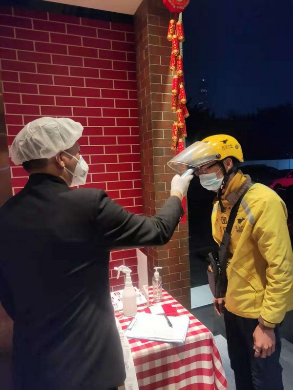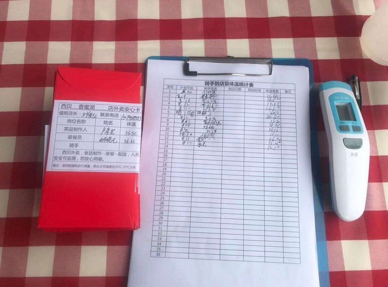 為了保障顧客和員工的健康,深圳西貝要求所有上班前的員工都需每半小時測一次體溫,每一個小時集中進行洗手消毒,公司還為每一位員工配備了符合要求的防護口罩。不僅如此,來外賣取餐的騎手也和店員分割開在店門口取餐,減少人員之間相互交流與接觸,每個騎手取餐前,必須接受體溫測量,手部消毒,確認(rèn)無誤,才可取餐。