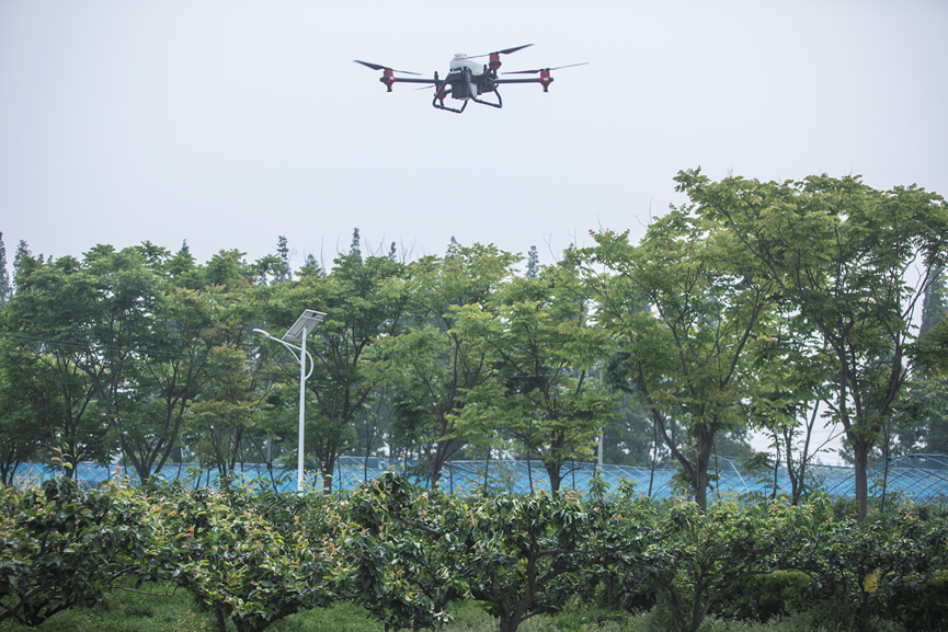 (上海首個(gè)盒馬村,翠冠梨數(shù)字農(nóng)業(yè)基地,無人機(jī)正在低空施藥)