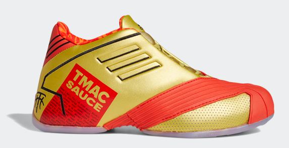 ? TMAC 1: 聯(lián)名款TMAC1采用金 屬色鞋面,搭配紅色細(xì)節(jié),外底綴金色拱門印花,致敬巨無(wú)霸醬——風(fēng)靡全球的巨無(wú)霸漢堡的獨(dú)特醬料。同時(shí)該鞋款也蘊(yùn)含麥蒂獨(dú)特“風(fēng)味配方”:干拔跳投、三分球、背身單打。