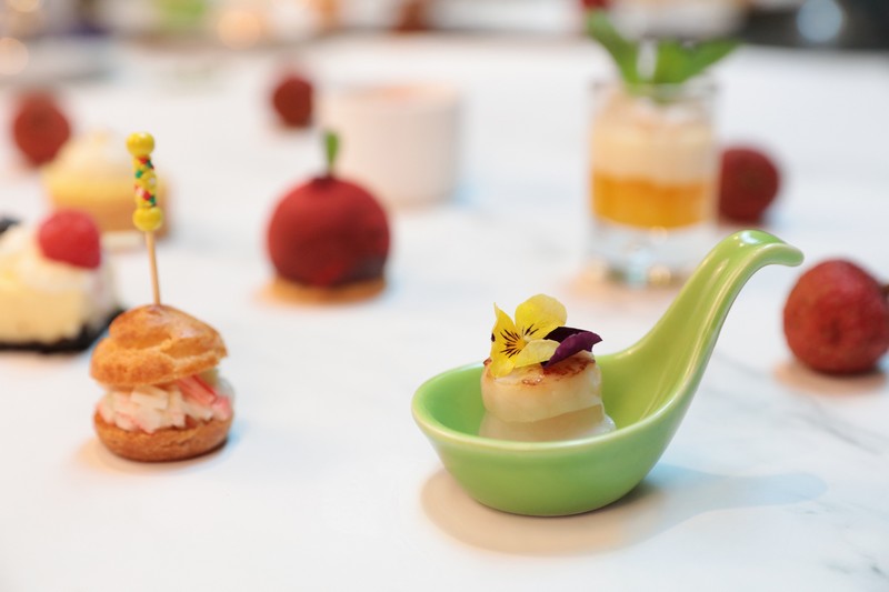 酒店餅房廚師長趙偉匠心獨運,使荔枝和傳統(tǒng)下午茶碰撞出別樣風(fēng)情:芒果恰到好處的酸甜邂逅荔枝的宜人甘美,香芒荔枝慕斯杯里滿載的不就是夏天的專屬甜蜜;芝士蛋糕的醇厚滋味被荔枝的清爽巧妙平衡,多層次的口感讓人無限回味;當(dāng)俏皮可人的荔枝被加入傳統(tǒng)甜品楊枝甘露,搭配冰涼爽口的荔枝雪芭,是妙趣橫生的獨特味覺體驗;法式焦糖燉蛋和荔枝的融合,恍若天成,是中西合璧的典范;日本帶子和荔枝的組合聽來不可思議,只有親試方能體會海陸鮮甜交匯的真意。