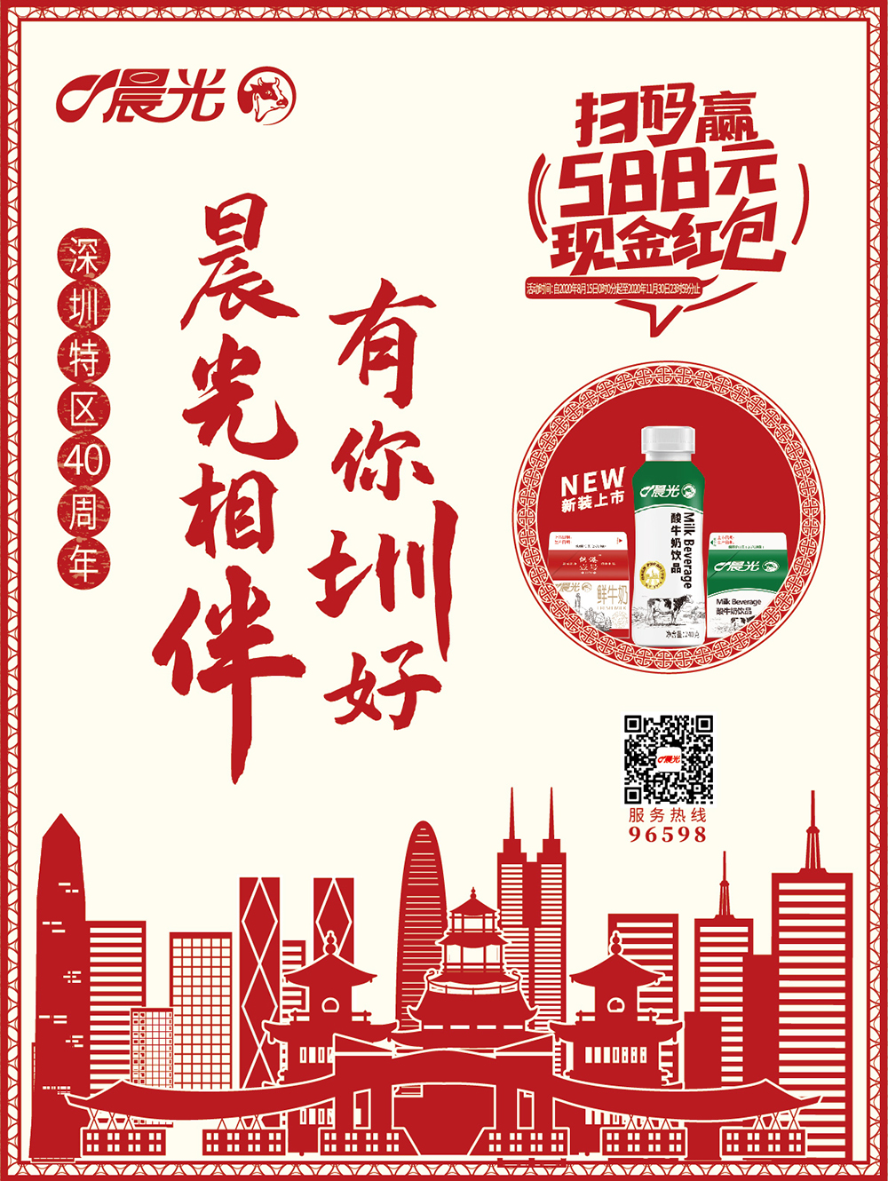 見圳客戶端·深圳新聞網(wǎng)2020年8月25日訊 作為深圳本土的國營乳制品公司,晨光乳業(yè)以“深圳特區(qū)40周年,晨光相伴,有你圳好”為主題,致敬深圳經(jīng)濟(jì)特區(qū)建立40周年。作為一家“深圳老字號”品牌企業(yè),晨光乳業(yè)以40周年為契機(jī),推出全新升級包裝的240g酸牛奶飲品以及掃碼贏588元紅包等多個(gè)主題活動(dòng),在與千萬深圳市民分享晨光40年的喜悅之情的同時(shí)共慶深圳經(jīng)濟(jì)特區(qū)成立40周年!